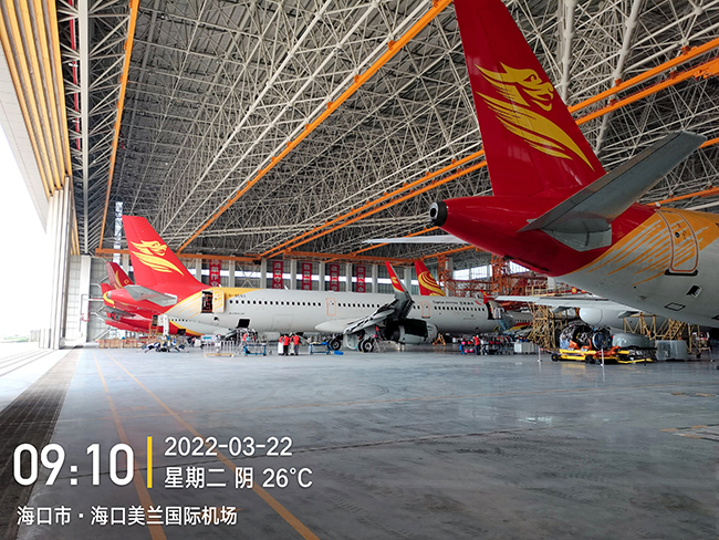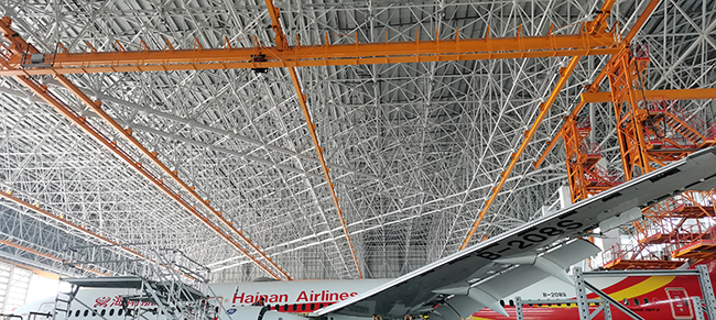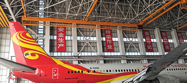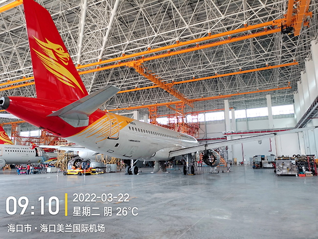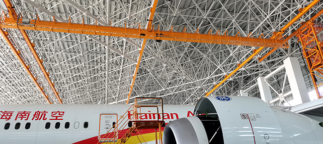 ??诳崭埏w機維修工程有限公司于2020年8月向奧力通采購海口民航飛機維修機庫用多支點超大跨度懸掛起重機8臺,應用于??诿捞m機場新基地機庫的建設,于2022年3月正式交付投入試運營,在中國南大門的自貿港中再添亮麗的一抹金色,奧力通成為海航飛機的最美守護神。