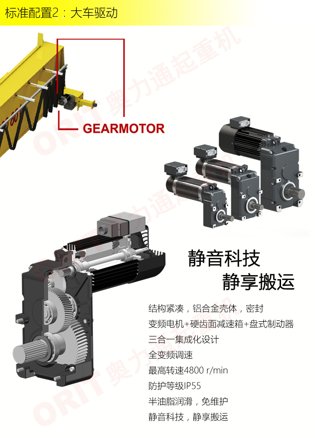 產品名稱:大噸位起重機 優化設計,自重輕,輪壓小,高度矮 硬齒面柔性驅動,緊湊型結構 變頻控制,運行平穩 實時安全監控,確保吊運安全 標準化配置,讓性能無比穩定 適用于500t以下雙梁起重機 標準配置1:起升機構 顛覆傳統,自成一體 SWL(t) HOL(m) 5-500t Max.160m 歐式智能卷揚 高度矮,自重輕,節約建筑成本 重級制,滿足持續重載作業 柔性驅動,內應力小,傳動效率高 免維護 適配各種吊具 智能化:寸動/微動/電子防搖 故障自診斷系統及HMI 標準配置2:三合一驅動 靜音科技,靜享搬運 結構緊湊,鋁合金殼體,密封 變頻電機+硬齒面減速箱+盤式制動器 龍門專用C型三合一集成化設計,節約空間 全變頻調速 最高轉速4800 r/min 防護等級IP55 半油脂潤滑,免維護 靜音科技,靜享搬運 標準配置3:電控系統 安全隨心掌控 智能安全監控器 計算起升機構剩余安全工作時間 累計起升工作時間 累計超載次數 累計起升電機啟動次數 起升電機過熱保護及報警 剎車片厚度報警 ... ... 遠程通訊 施耐德電氣元件 航空插座接口 IP55防護等級 互聯網+ HIM人機交互界面 無線遠程控制 物聯網遠程管理 4G移動通訊 遠程診斷系統 信息系統 自動化 速度擴展功能 電子防搖功能 自動糾偏功能 寸動功能 防沖擊功能 自動中心定位 同步功能 標準配置4:端梁 多變靈活,適應自如 模塊化直驅設計 自重輕、體積小 多種連接方式,安裝尺寸靈活 適用各種廠房,降低廠房高度 QT700車輪,自潤滑,更靜音 采用調心軸承,適應更自如 應用