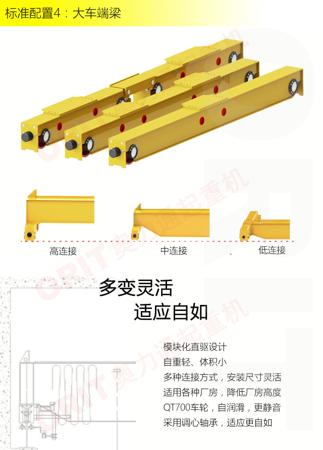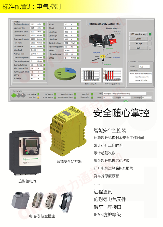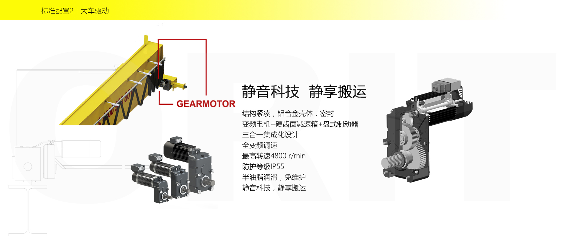 產品名稱:單梁橋式起重機 小身材、大能力、高智慧 優化設計,自重輕,輪壓小,高度矮 硬齒面柔性驅動,緊湊型結構 變頻控制,運行平穩 實時安全監控,確保吊運安全 標準化配置,讓性能無比穩定 適用于32t以下額定載荷 標準配置1:起升機構 顛覆傳統,自成一體 低凈空設計 柔性驅動,內應力小,傳動效率高 重級制電機,接電持續率60%ED 行走變頻無極調速,運行平穩 自調試電磁盤式制動器,可靠,防塵 2160N/mm2 高強度鍍鋅鋼絲繩,免維護 全周型導繩器,防松繩 全系標配安全監控系統 標準配置2:三合一驅動 靜音科技,靜享搬運 結構緊湊,鋁合金殼體,密封 變頻電機+硬齒面減速箱+盤式制動器 三合一集成化設計 全變頻調速 最高轉速4800 r/min 防護等級IP55 半油脂潤滑,免維護 靜音科技,靜享搬運 標準配置3:電控系統 安全隨心掌控 智能安全監控器 計算起升機構剩余安全工作時間 累計起升工作時間 累計超載次數 累計起升電機啟動次數 起升電機過熱保護及報警 剎車片厚度報警 ... ... 遠程通訊 施耐德電氣元件 航空插座接口 IP55防護等級 標準配置4:端梁 多變靈活,適應自如 模塊化直驅設計 自重輕、體積小 多種連接方式,安裝尺寸靈活 適用各種廠房,降低廠房高度 QT700車輪,自潤滑,更靜音 采用調心軸承,適應更自如 應用