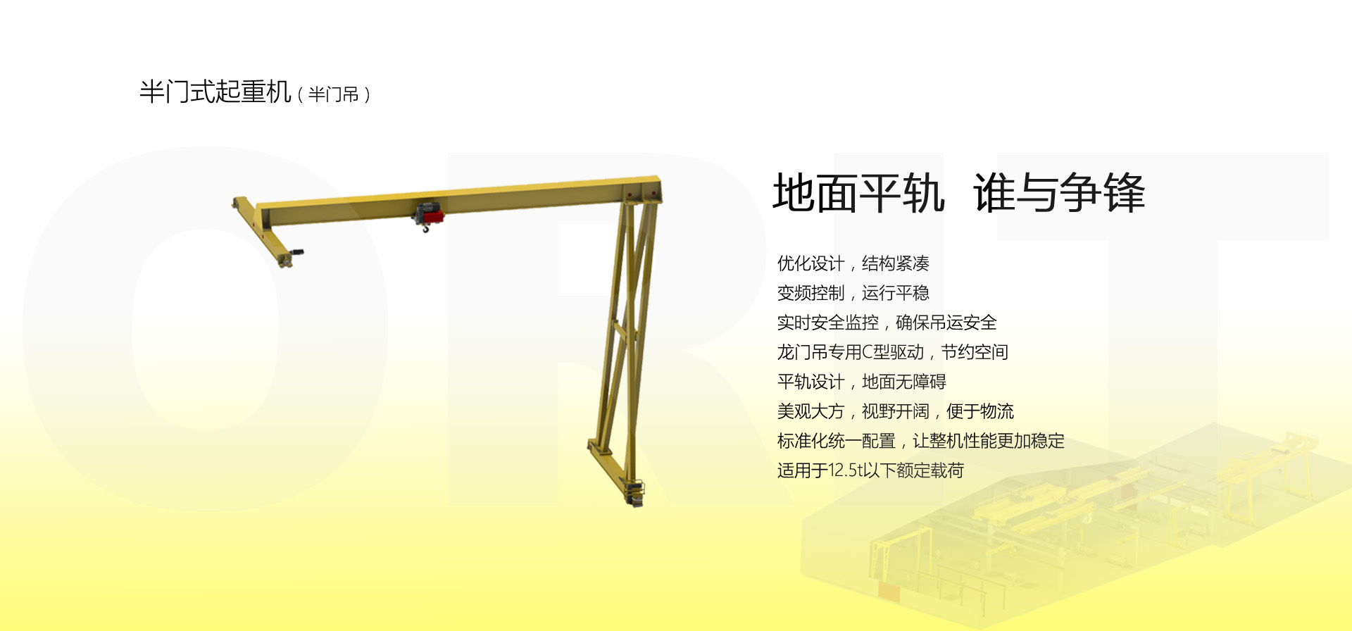 產品名稱:半門式起重機 優化設計,結構緊湊 變頻控制,運行平穩 實時安全監控,確保吊運安全 龍門吊專用C型驅動,節約空間 平軌設計,地面無障礙 美觀大方,視野開闊,便于物流 標準化配置,讓性能無比穩定 適用于12.5t以下額定載荷 標準配置1:起升機構 顛覆傳統,自成一體 低凈空設計 柔性驅動,內應力小,傳動效率高 重級制電機,接電持續率60%ED 行走變頻無極調速,運行平穩 自調試電磁盤式制動器,可靠,防塵 2160N/mm2 高強度鍍鋅鋼絲繩,免維護 全周型導繩器,防松繩 全系標配安全監控系統 標準配置2:三合一驅動 靜音科技,靜享搬運 結構緊湊,鋁合金殼體,密封 變頻電機+硬齒面減速箱+盤式制動器 龍門專用C型三合一集成化設計,節約空間 全變頻調速 最高轉速4800 r/min 防護等級IP55 半油脂潤滑,免維護 靜音科技,靜享搬運 標準配置3:電控系統 安全隨心掌控 智能安全監控器 計算起升機構剩余安全工作時間 累計起升工作時間 累計超載次數 累計起升電機啟動次數 起升電機過熱保護及報警 剎車片厚度報警 ... ... 遠程通訊 施耐德電氣元件 航空插座接口 IP55防護等級 標準配置4:端梁 多變靈活,適應自如 模塊化直驅設計 自重輕、體積小 多種連接方式,安裝尺寸靈活 適用各種廠房,降低廠房高度 QT700車輪,自潤滑,更靜音 采用調心軸承,適應更自如 獨特的平軌設計,地面無死角,物流無障礙 平軌半門式起重機,工業設計的匠心所在