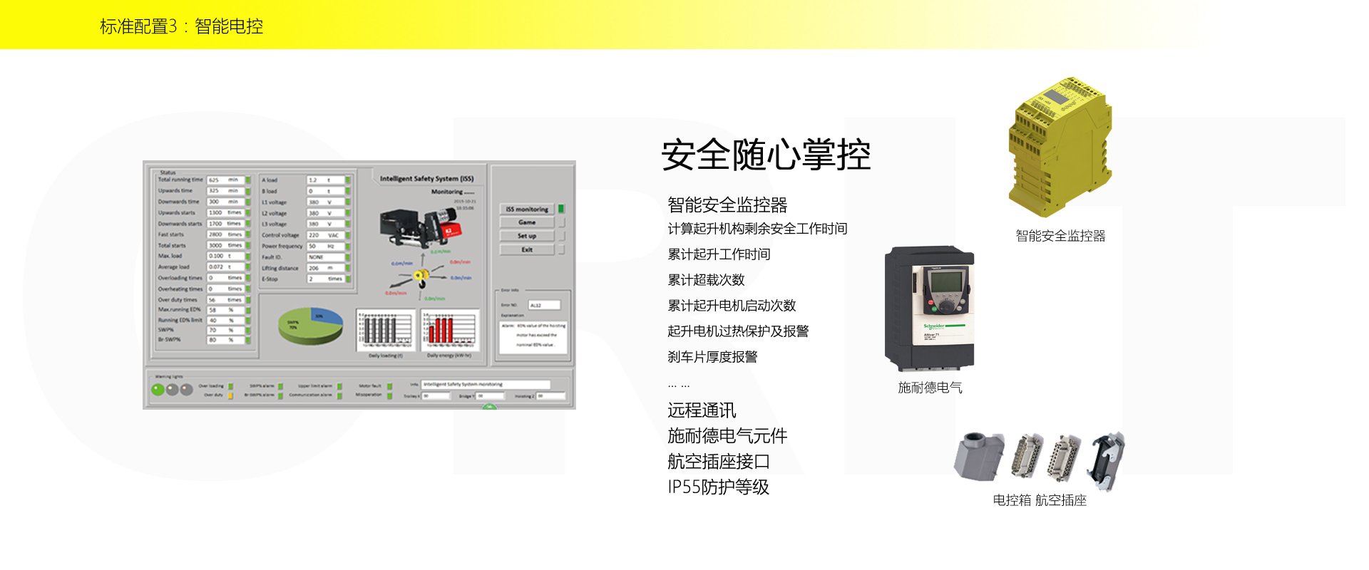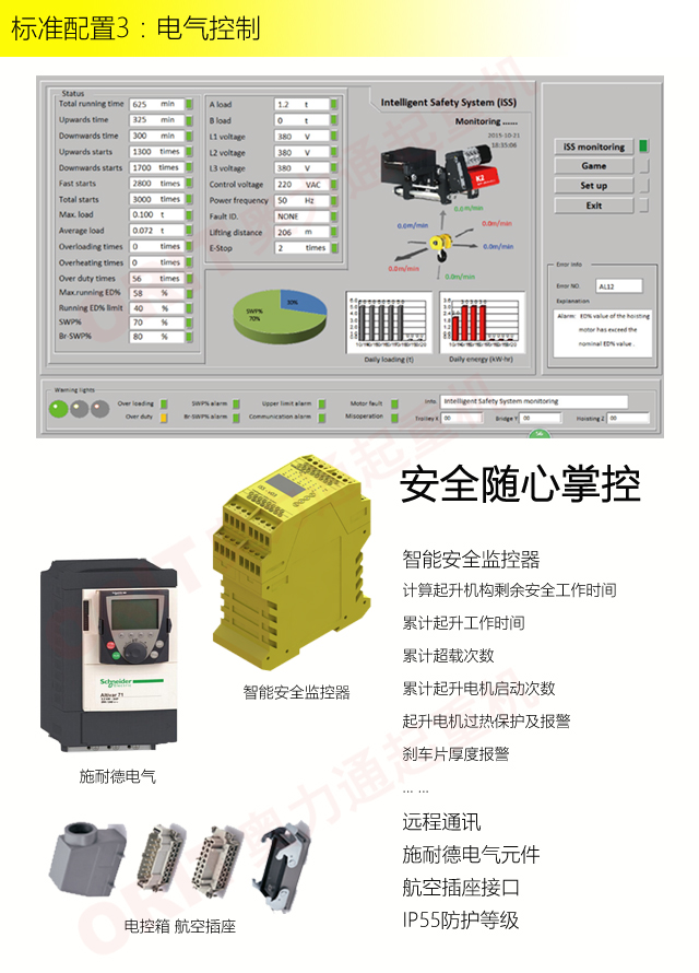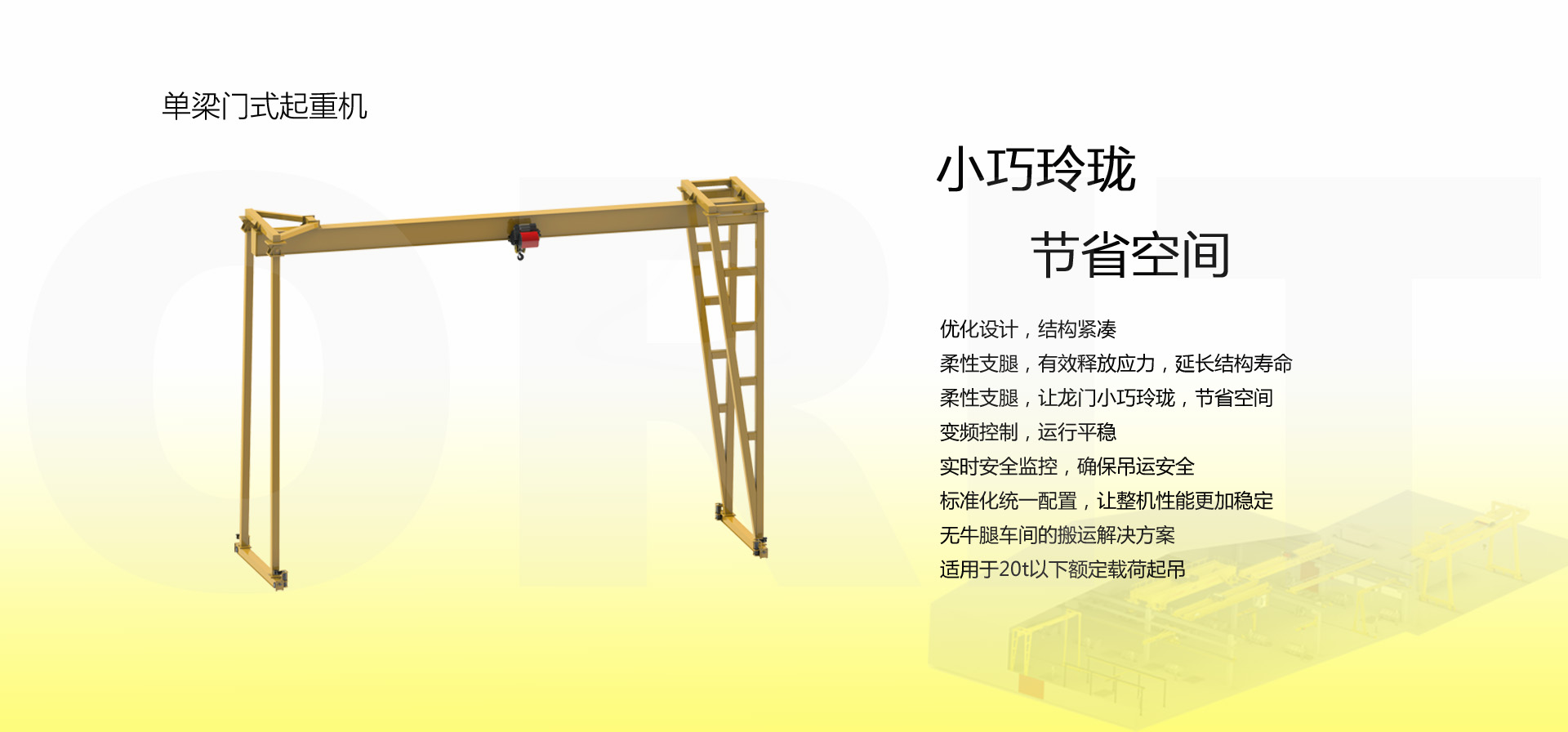 產品名稱:單梁門式起重機 小巧玲瓏,節省空間 優化設計,結構緊湊 柔性支腿,有效釋放應力,延長結構壽命 柔性支腿,讓龍門小巧玲瓏,節省空間 變頻控制,運行平穩 實時安全監控,確保吊運安全 標準化配置,讓性能無比穩定 無牛腿車間搬運的最佳解決方案 適用于20t以下額定載荷起吊 標準配置1:起升機構 顛覆傳統,自成一體 低凈空設計 柔性驅動,內應力小,傳動效率高 重級制電機,接電持續率60%ED 行走變頻無極調速,運行平穩 自調試電磁盤式制動器,可靠,防塵 2160N/mm2 高強度鍍鋅鋼絲繩,免維護 全周型導繩器,防松繩 全系標配安全監控系統 標準配置2:三合一驅動 靜音科技,靜享搬運 結構緊湊,鋁合金殼體,密封 變頻電機+硬齒面減速箱+盤式制動器 龍門專用C型三合一集成化設計,節約空間 全變頻調速 最高轉速4800 r/min 防護等級IP55 半油脂潤滑,免維護 靜音科技,靜享搬運 標準配置3:電控系統 安全隨心掌控 智能安全監控器 計算起升機構剩余安全工作時間 累計起升工作時間 累計超載次數 累計起升電機啟動次數 起升電機過熱保護及報警 剎車片厚度報警 ... ... 遠程通訊 施耐德電氣元件 航空插座接口 IP55防護等級 標準配置4:端梁 多變靈活,適應自如 模塊化直驅設計 自重輕、體積小 多種連接方式,安裝尺寸靈活 適用各種廠房,降低廠房高度 QT700車輪,自潤滑,更靜音 采用調心軸承,適應更自如 應用